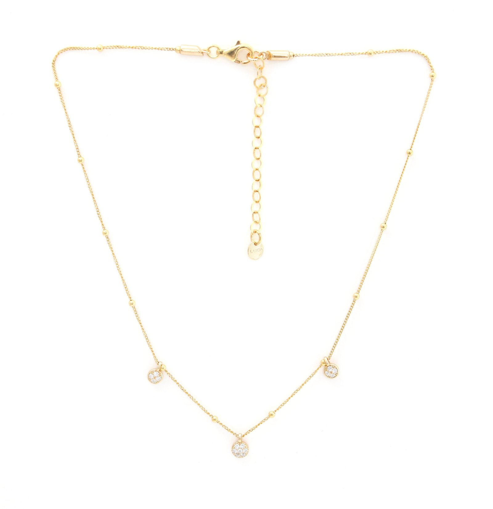 Collar con tres colgantes de la colección Mini Minimal, en plata dorada de 925 y circonita.